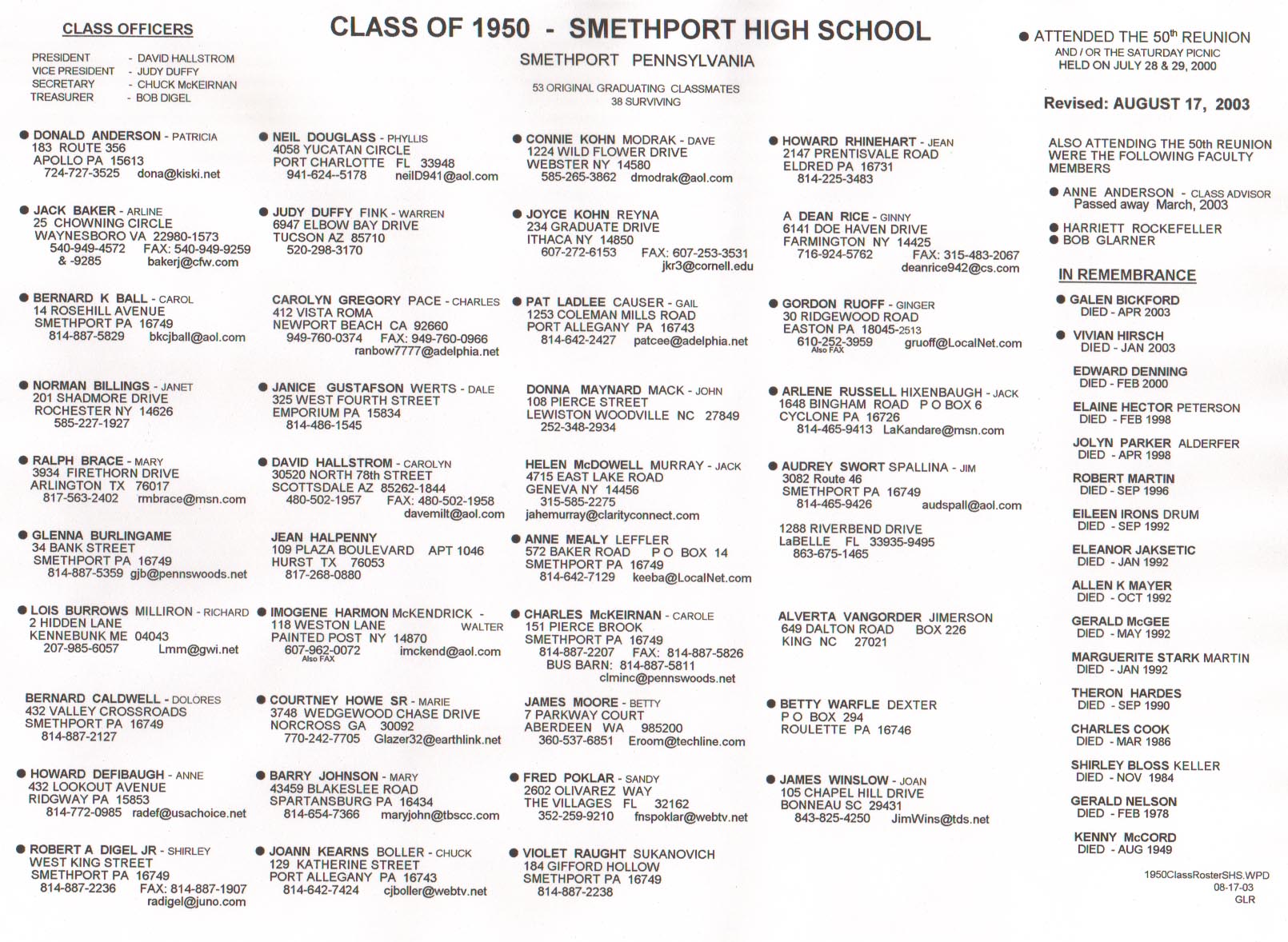 Class Roster maintained by Gordon Ruoff Revised 8/17/03 A special thanks to Gordon!